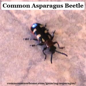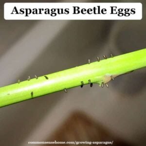 Slugs and asparagus beetles may want to dine on your asparagus. Watch for eggs and beetles, and hand pick them into a container of soapy water. Ducks love to eat slugs, and won’t bother the asparagus. You can read more about asparagus beetles at the University of Minnesota Extension.