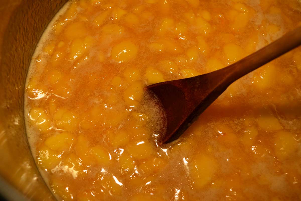 - In a large, non-reactive pot, combine peaches, orange juice, lemon juice and the calcium water. Bring to a full boil.